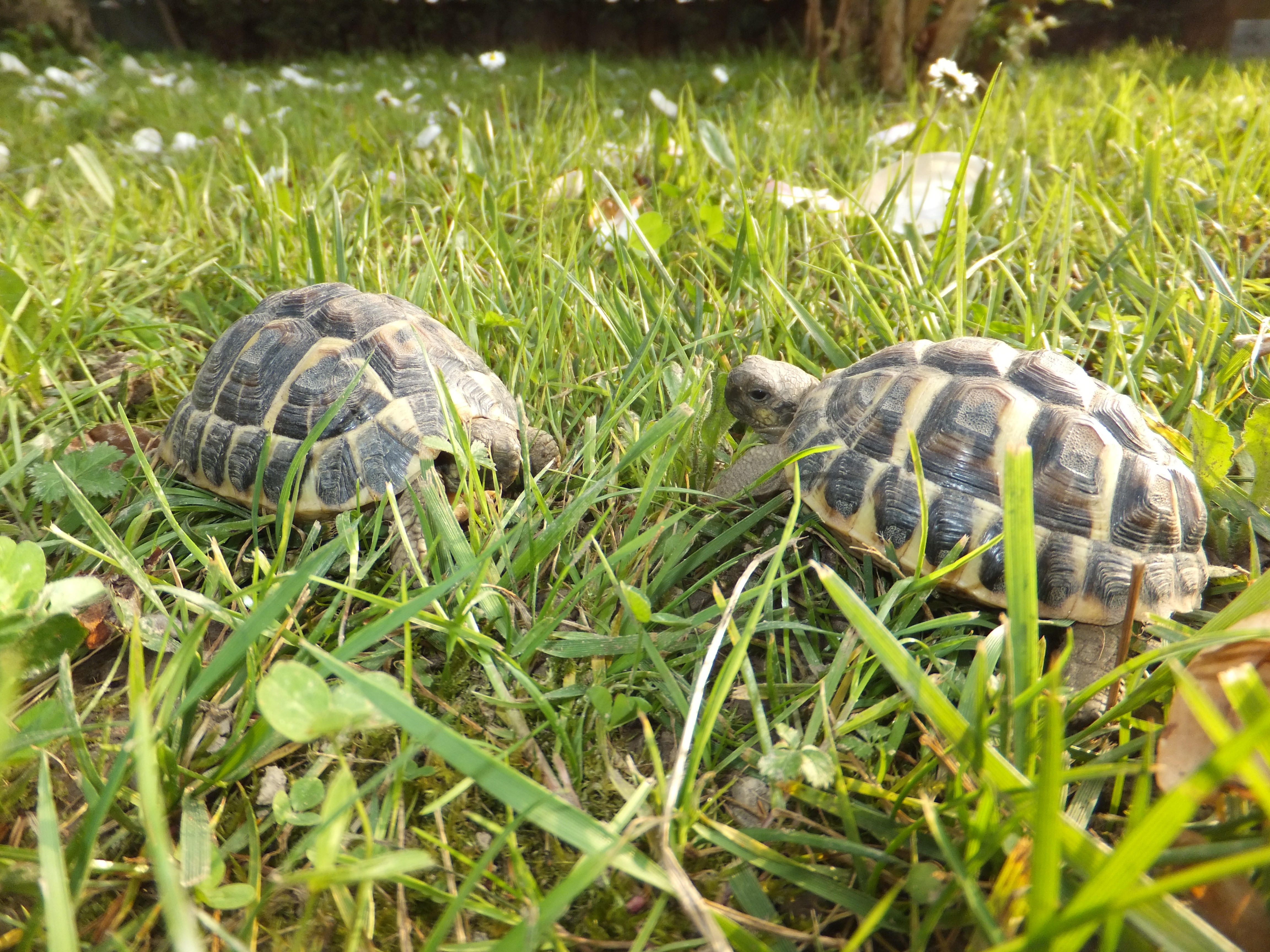 Questi i genitori delle piccole testudo Hermanni, Si tratta di una coppia di Hermanni Hermanni nate nel 2002 (la femmina) e nel 2003 (il maschio). In perfetta salute godono di ampi spazi in cui muoversi e in cui termoregolarsi. Sono allevate da me da quando erano giovani e da anni ormai depongono un buon numero di uova fertili che pongo in incubatrice per garantire un buon equilibri di maschi e femmine considerando che il sesso dei cuccioli dipende dalla temperatura di incubazione.